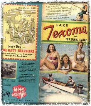 A map is not really a souvenir, but I cannot help myself here, so I’m including a photo and brief description of a Lake Texoma map from the 1950s. It was put out by the M-KT Railroad which ceased operations in 1988, having operated in Texas, Kansas, Oklahoma and Missouri since it began in the 1870s.